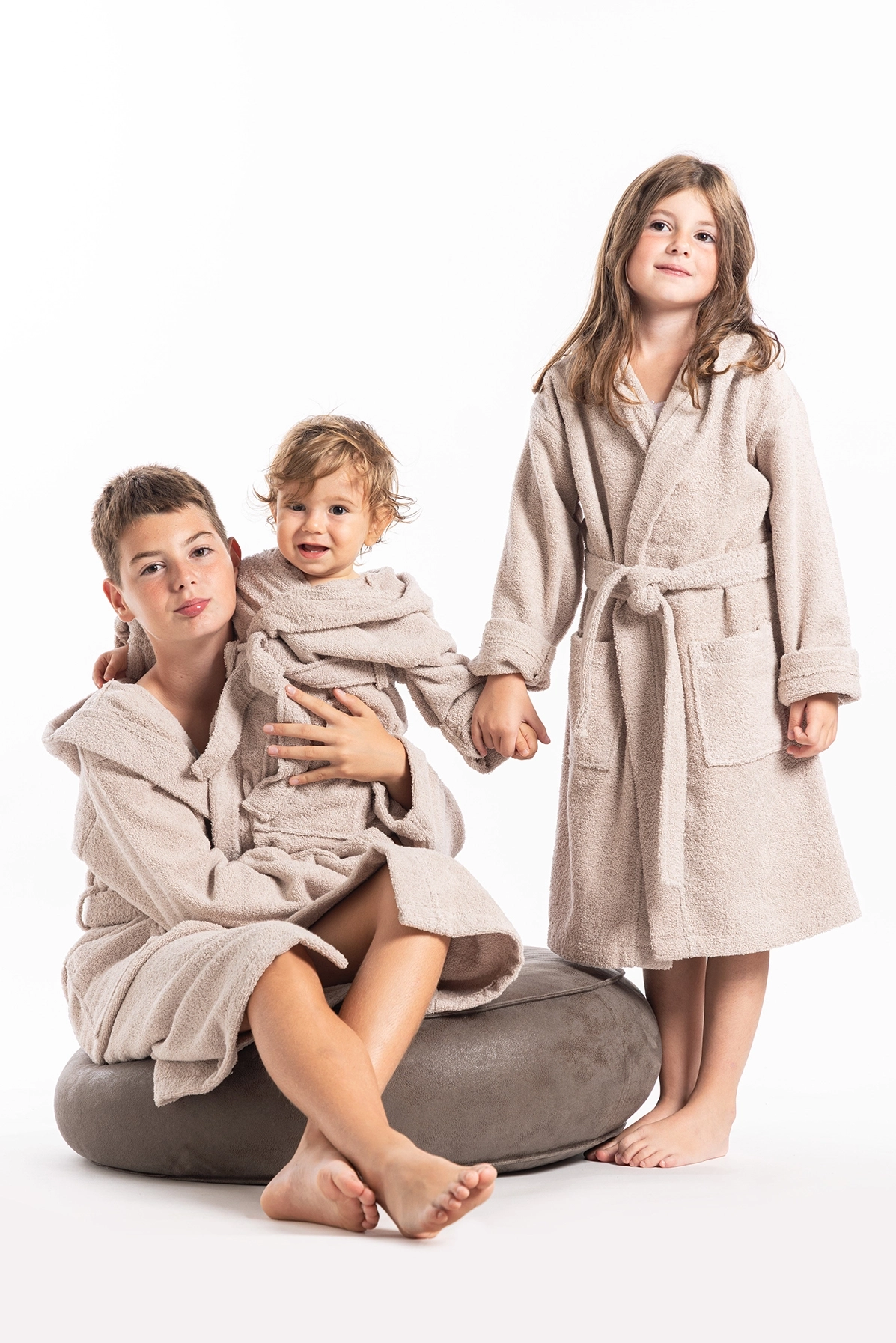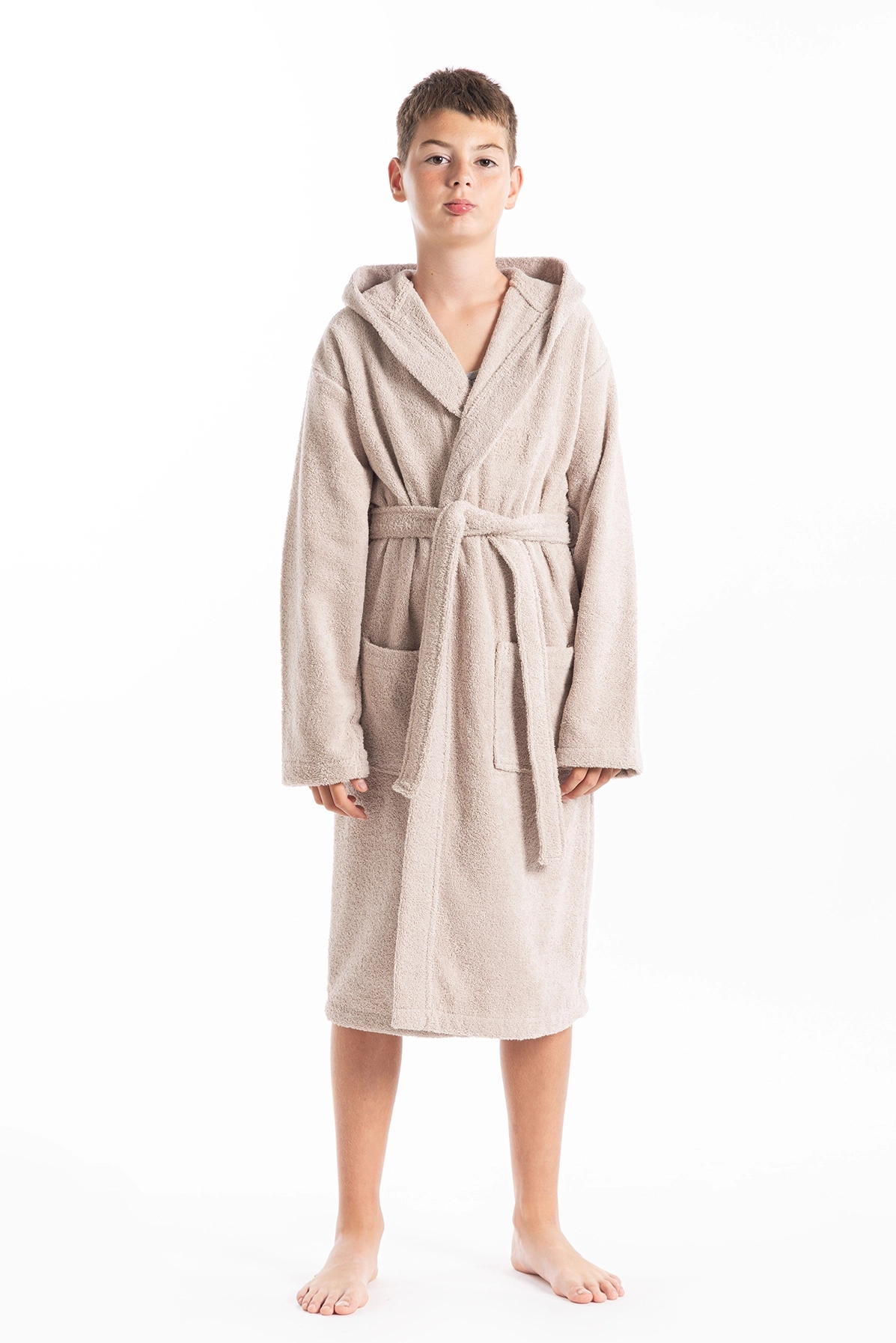Dečiji bademantil u bež boji deo je Basic kolekcije. Izrađen je od 100% kvalitetnog pamuka, koji je izuzetno mekan i prijatan, pa savršeno odgovara i najosetljivijoj dečijoj koži.