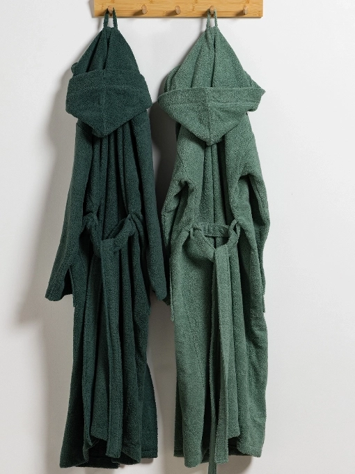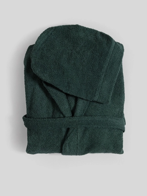 Naš unisex bademantil od 100% pamuka u tamno zelenoj boji nudi udobnost i praktičnost sa svoja dva prednja džepa, kapuljačom i pojasom.