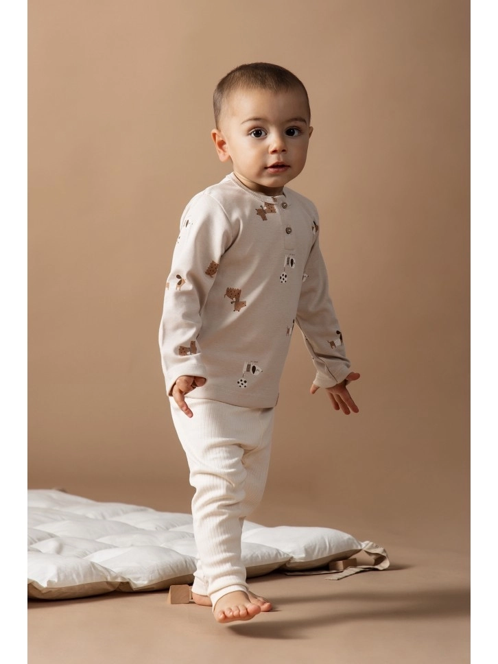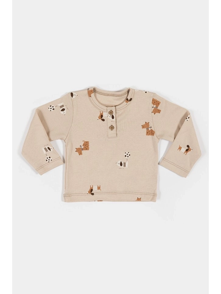 Bebi majica dugih rukava za dečake u bež boji sa kucama deo je naše Bubi&Lole linje za bebe i decu.