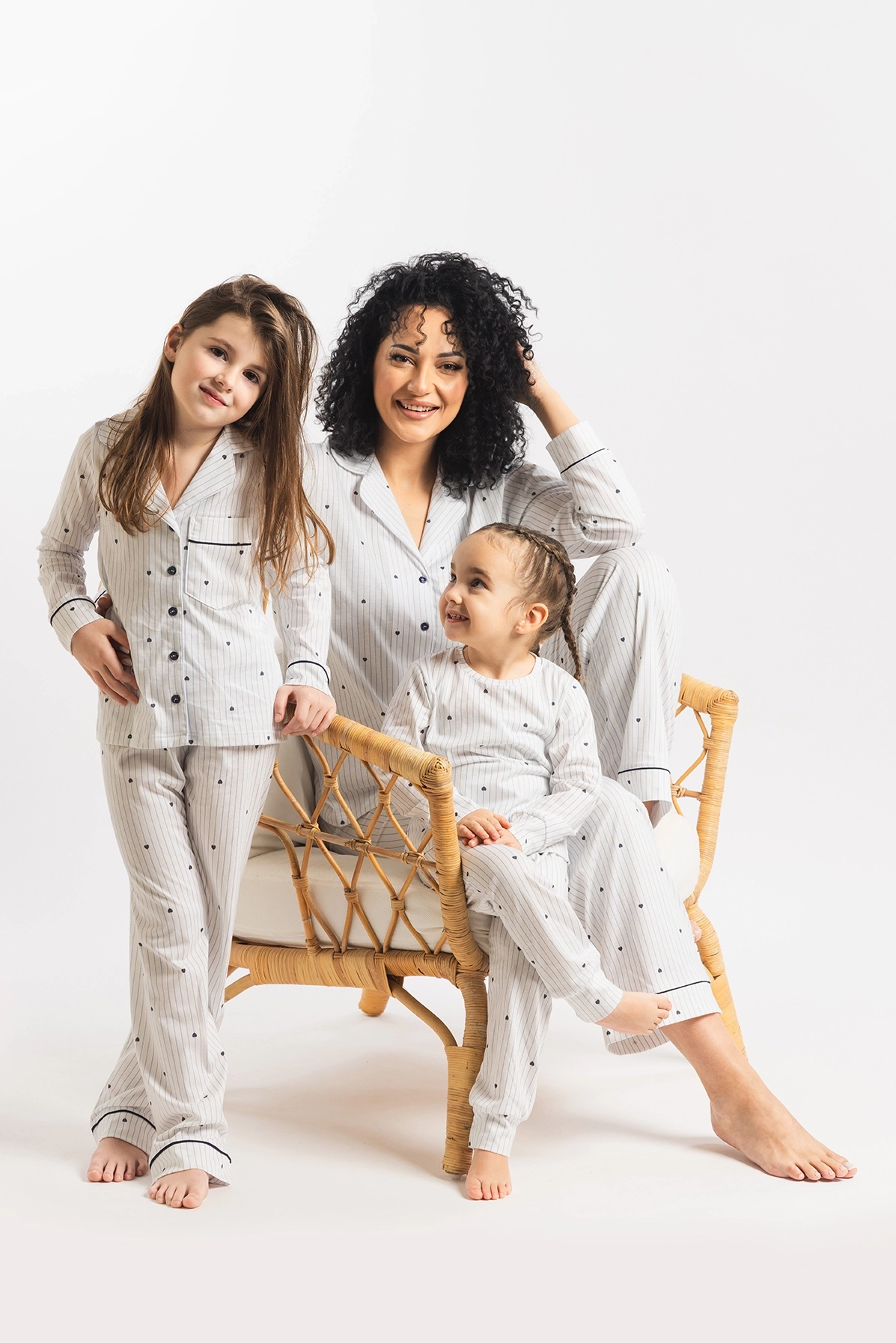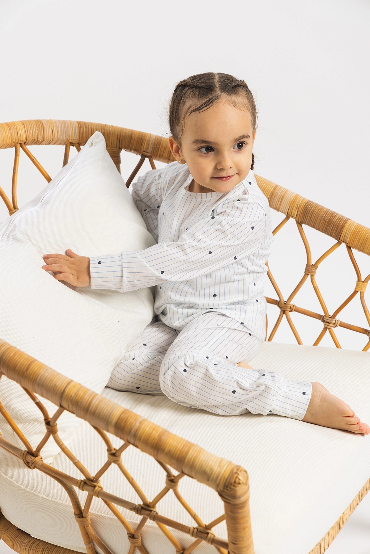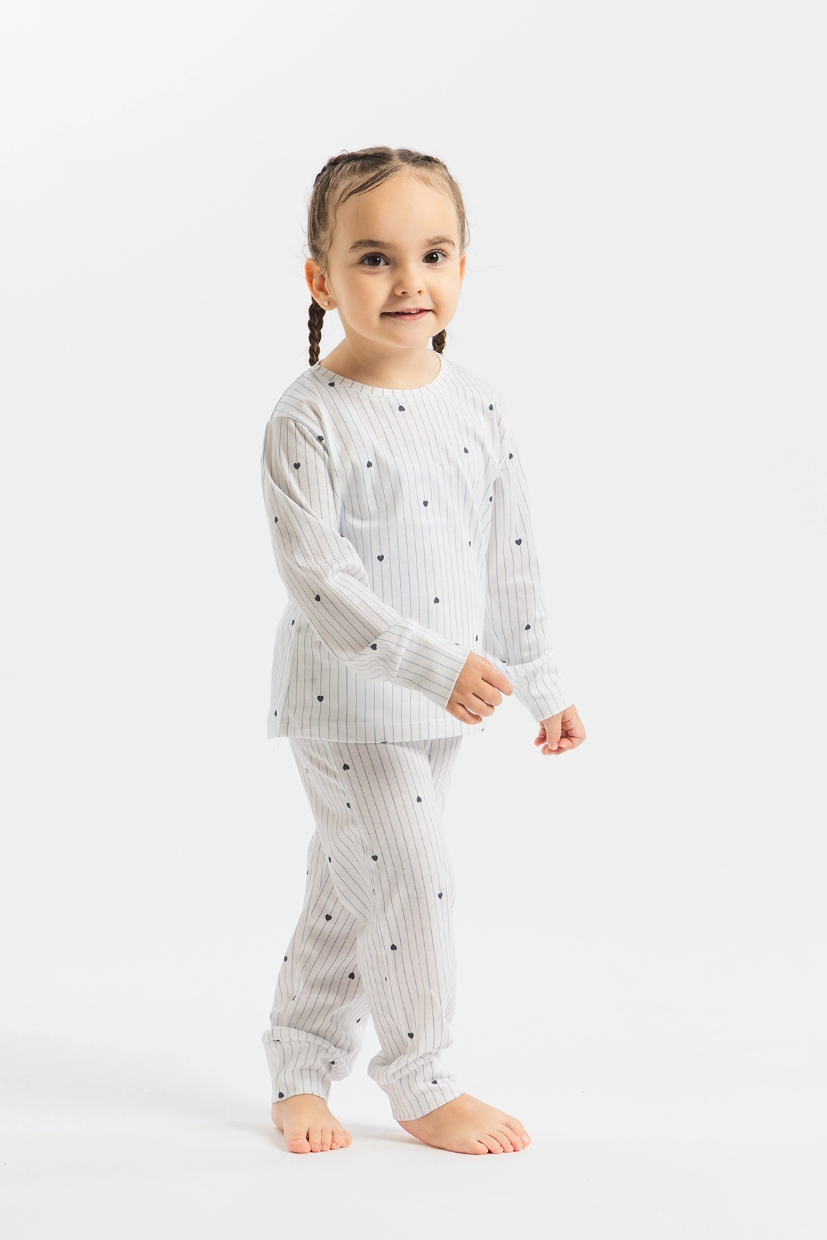 Pidžama za devojčice u beloj boji sa dezenom pruge i srca je deo MyHeart kolekcije.