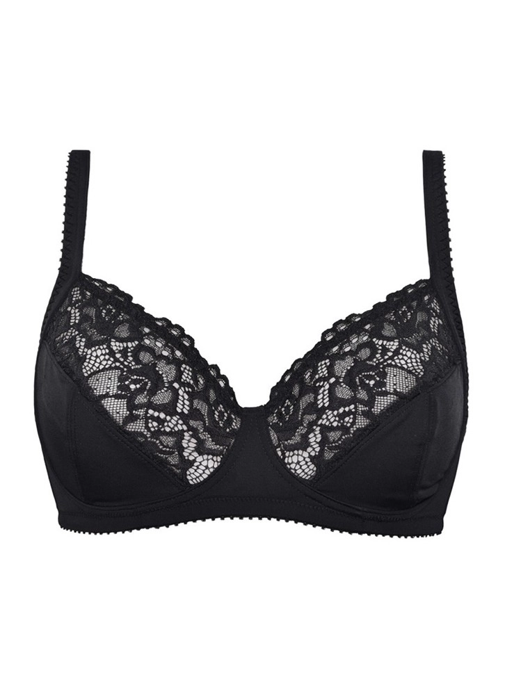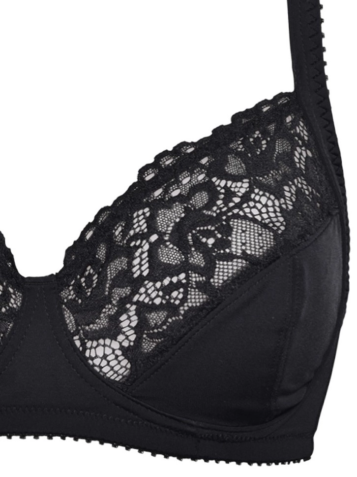 Grudnjak bez donje žice napravljen od rastegljivih mikrovlakana u kombinaciji sa čipkom. Korpe su C dubine i obložene pamukom iznutra, a bretele su podesive.