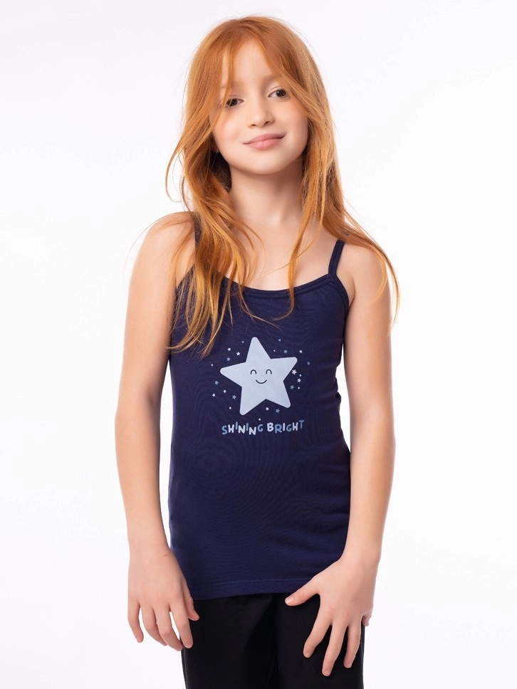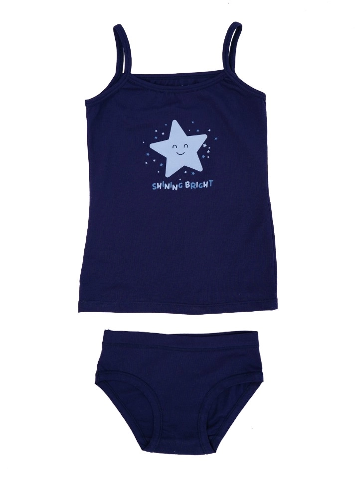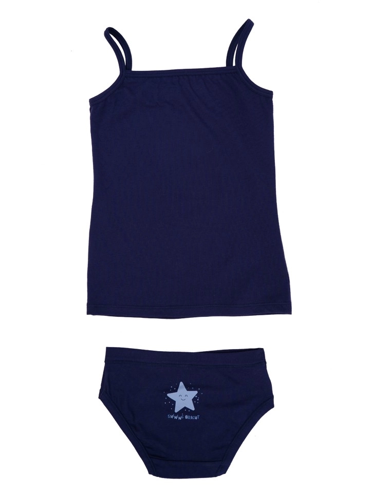 Komplet veš za devojčice u teget boji sa dezenom deo je Space kolekcije. Komplet čine majica i slip gaćice. Majica na uske bretele ima ravan kroj i lepo se kombinuje leti kao spoljna majica sa šorcem.