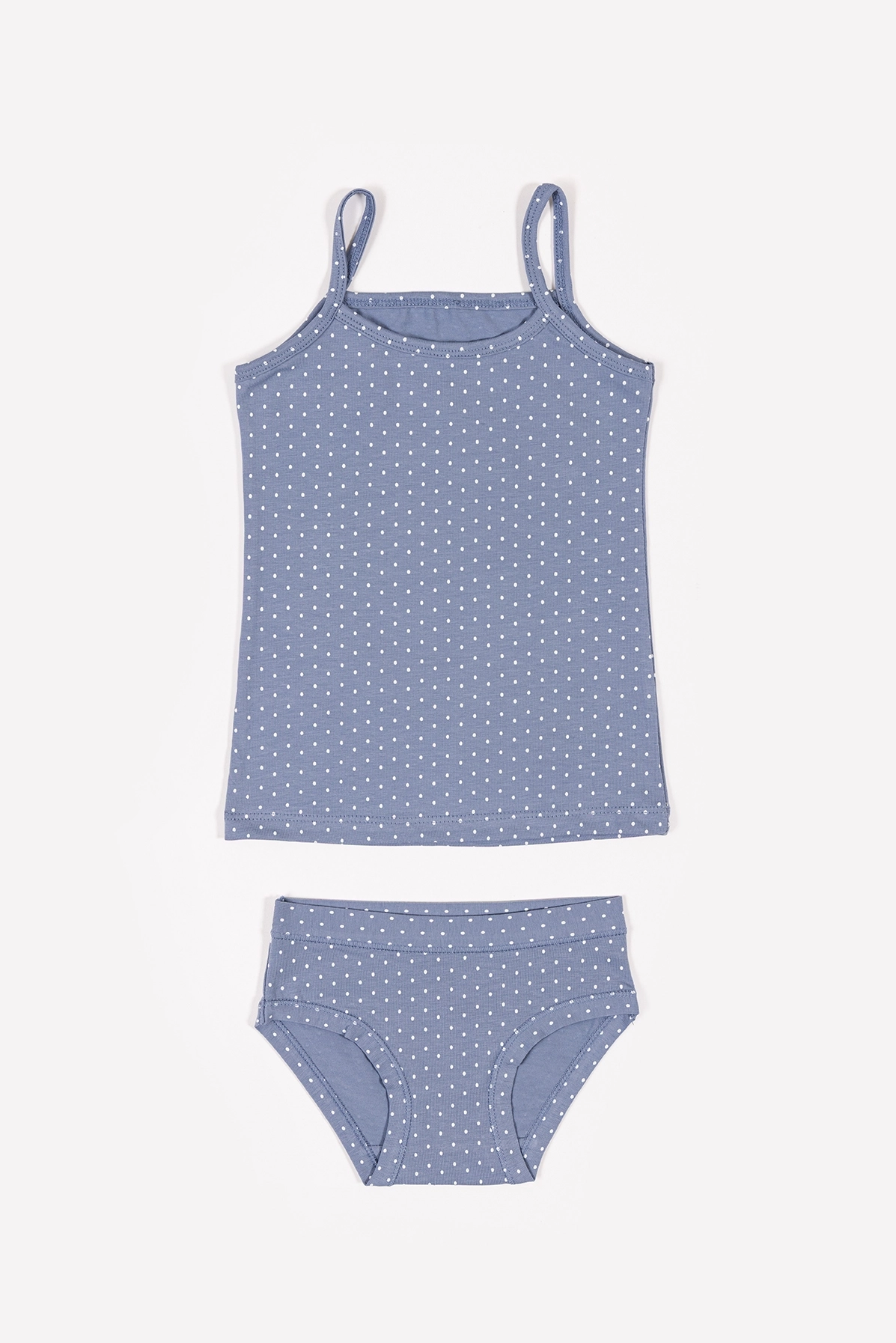 Komplet veš za devojčice u plavoj boji sa dezenom deo je klasične kolekcije. Komplet čine majica i slip gaćice. Majica na uske bretele ima ravan kroj i lepo se kombinuje leti kao spoljna majica sa šorcem.