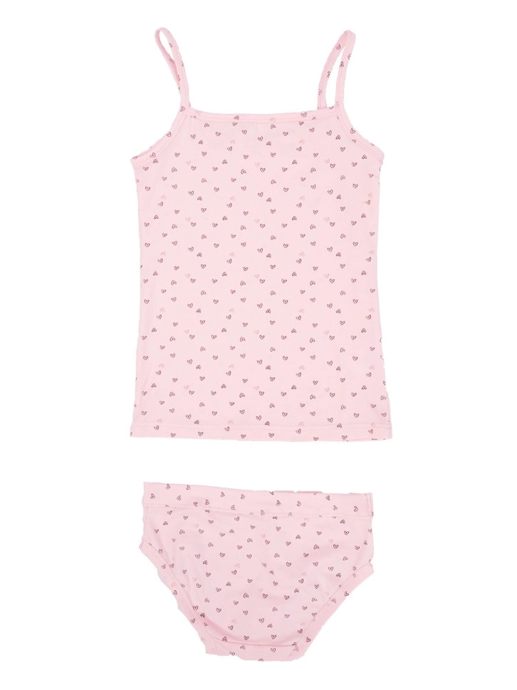 Komplet veš za devojčice u roze boji sa dezenom deo je klasične kolekcije. Komplet čine majica i slip gaćice. Majica na uske bretele ima ravan kroj i lepo se kombinuje leti kao spoljna majica sa šorcem.