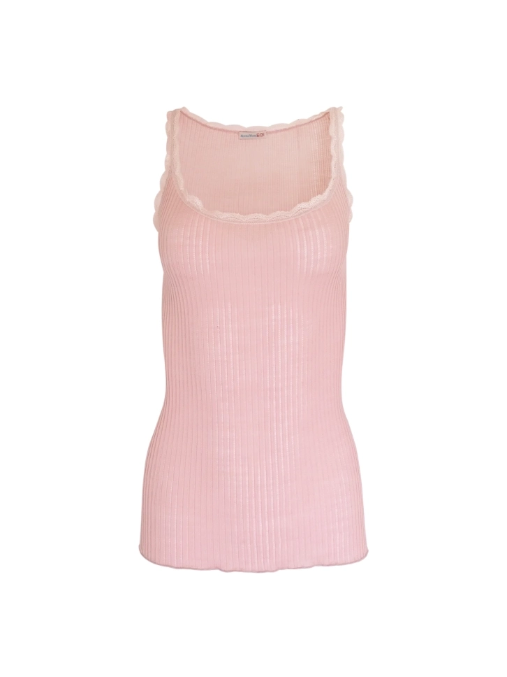 Mekana, prijatna i lagana ženska majica na bretele u puder roze boji. Ova majica ima širok okrugao izrez oko vrata i na sebi ima čipku sa spoljašnje strane bretela i na vratnom izrezu. Sačinjena je od mekane vune koja prija koži.
