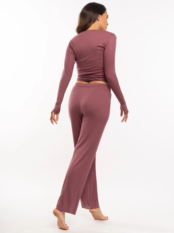 Izrađena je od meke viskoze sa dodatkom elastana, što pruža osećaj komfora tokom celog dana, ali i za lagane sportske aktivnosti poput joge i pilatesa. Majica ima rupu u rukavima za palac i lagano opušten kroj.
