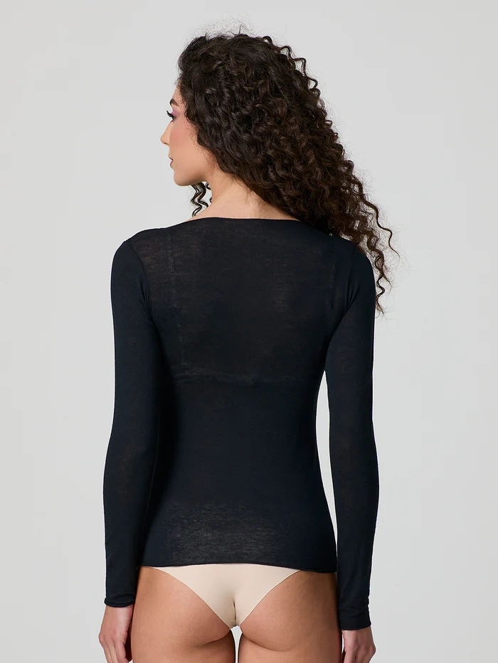 Ženska majica dugih rukava sa čamac izrezom kreirana je od kombinacije modala i mekog kašmira.