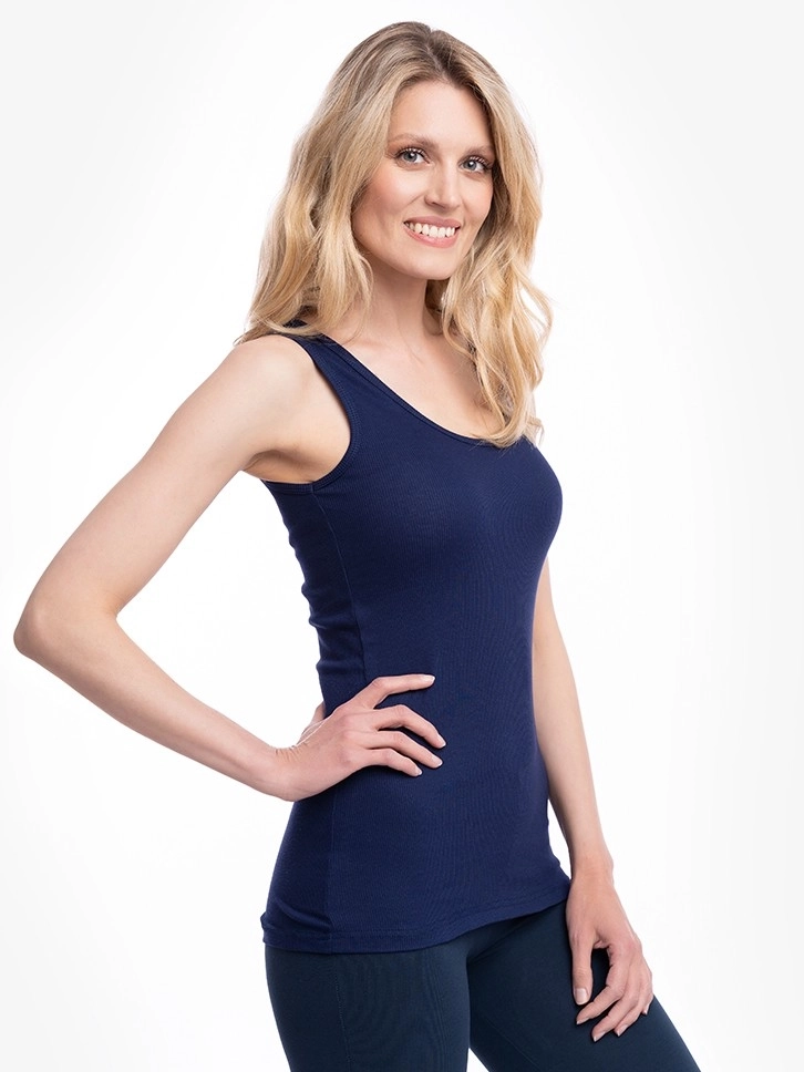 Ženska pamučna atlet majica sa bretelama srednje širine. Materijal je od sitnih prugica koji doprinosi izgledu majice. Majica je uskog kroja i ide uz telo.