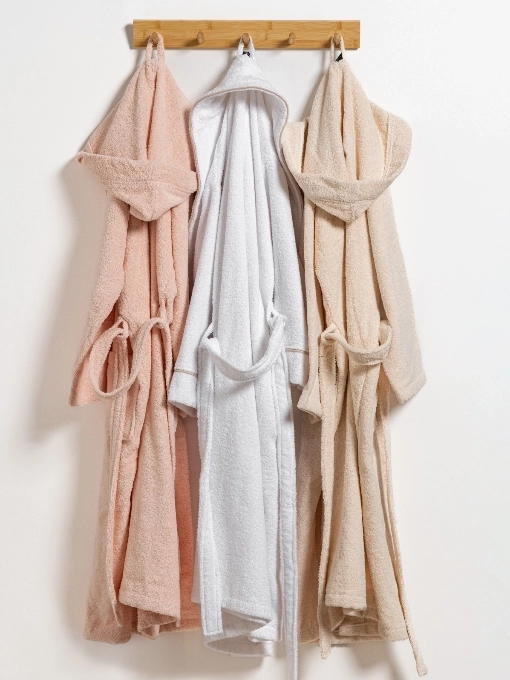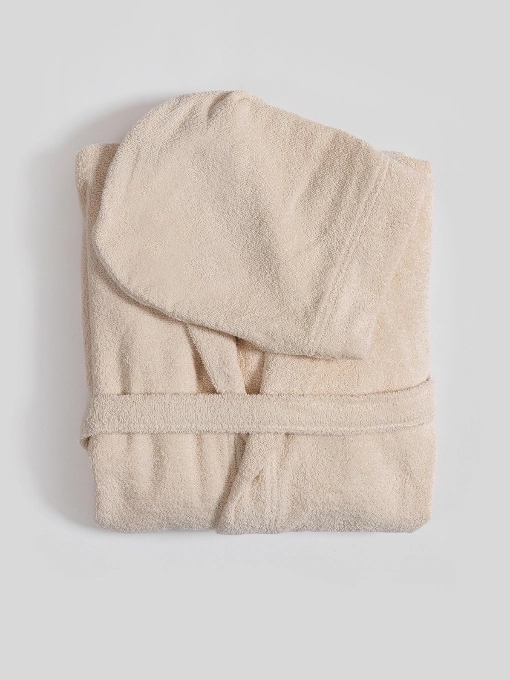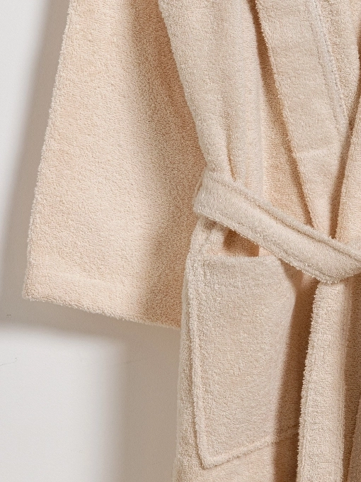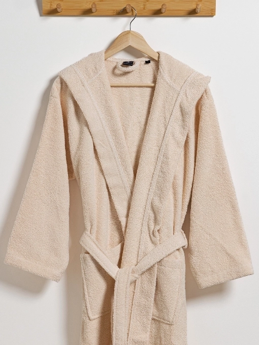 Naš unisex bademantil od 100% pamuka u nežnoj krem boji nudi udobnost i praktičnost sa svoja dva prednja džepa, kapuljačom i pojasom.
